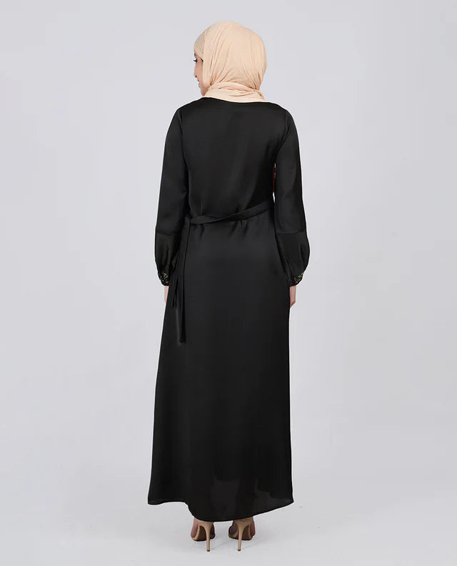 اللوحة المطرزة بالألوان المتعددة في الأمام تعطي التصميم عمق وملمس غني يلفت الأنظار. مع ياقة دائرية وفتحة أمامية بحبل رفيع، وحزام نسيجي عند الخصر لتحديده بشكل جميل، بالإضافة إلى أكمام مطاطية وقصّة فضفاضة تمنحك حرية الحركة بأناقة.