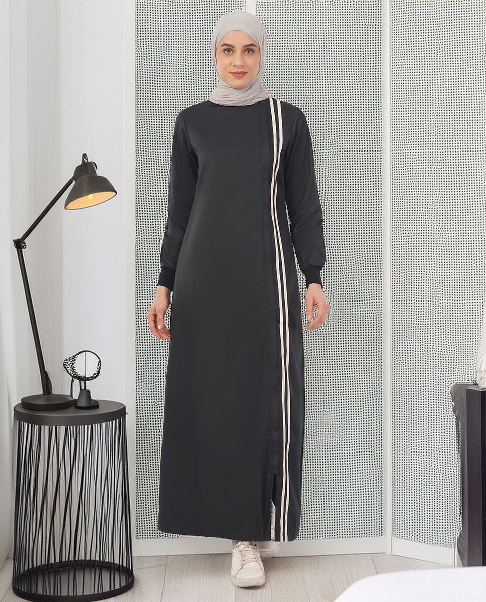 جلباب أنيق ومريح مصنوع من قماش بوليستر تويل ناعم. مصمم بياقة دائرية أنيقة، وتفاصيل أمامية أنيقة، وسحاب جانبي مخفي لسهولة الارتداء. مثالي للارتداء اليومي المحتشم بلمسة عصرية.